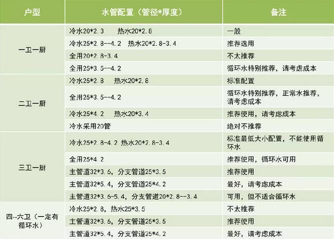 3.在預(yù)算成本寬松的情況下,可以選擇最高配置,在預(yù)算成本緊張的情況下,首先考慮管的大小,在考慮管壁厚度。因?yàn)楣軓酱笮Q定水壓大小,管壁厚度決定耐用性和突發(fā)事件。比如,我們的冷水管只要用到20*2.3,25*2.8,32*3.6,熱水管只要用20*2.8,25*3.5,32*5.4,就已經(jīng)完全滿足家裝水壓要求。但是,厚的水管也是有很多好處的,一個(gè)是耐用性時(shí)間要長(zhǎng)一些,一個(gè)是在突發(fā)情況下,比如低溫,比如長(zhǎng)期高溫(熱水器出口)就有優(yōu)勢(shì)。一定是先選擇大小,在選擇厚度。同時(shí),我們?cè)诳囱b飾公司預(yù)算時(shí),很多時(shí)候大小厚度產(chǎn)生的成本遠(yuǎn)遠(yuǎn)超過了品牌之間的價(jià)格差距。很多低端公司采用報(bào)高端名牌的牌子,采用很小管徑的水管和管件,甚至偷工減料,布管不完全,甚至假貨,他的成本還沒有普通水管正常配置的成本高。