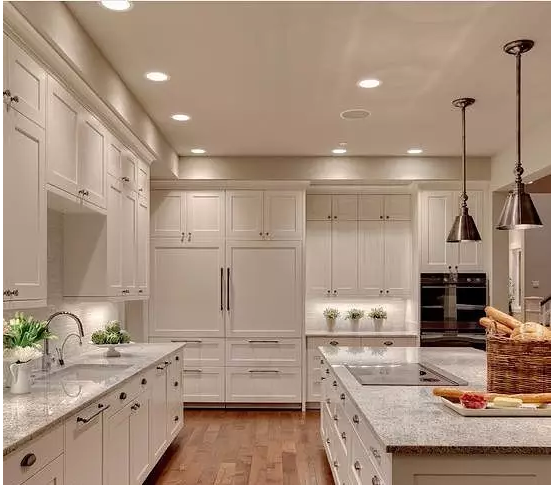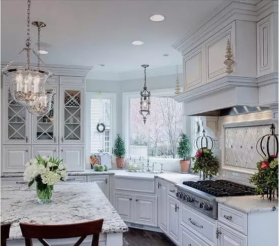 所以,如果櫥柜做到頂要滿足空間感及美觀的一般是廚房空間比較大,甚至是開放式廚房,設(shè)計(jì)層次感較多,相對(duì)復(fù)雜一點(diǎn),并且很少會(huì)有現(xiàn)代風(fēng)格的,如下圖: